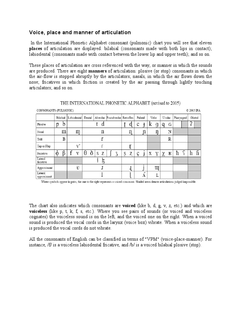 Sounds Place Voice Manner Chart Manners Chart Speech And